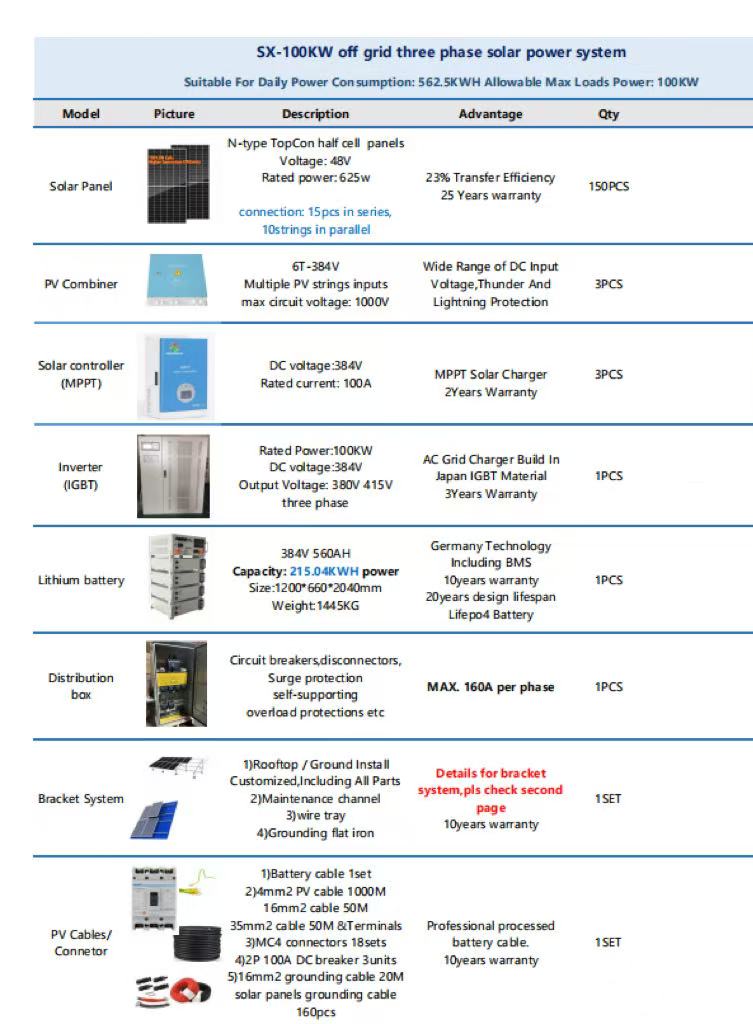 The full solution includes: high-efficiency solar panels, sturdy corrosion-resistant solar mounting brackets, long-cycle solar batteries supporting over 8,000 charge-discharge cycles, a solar inverter integrated with MPPT controller (conversion efficiency ≥95%), high-temperature resistant solar cables, and waterproof MC4 connectors.